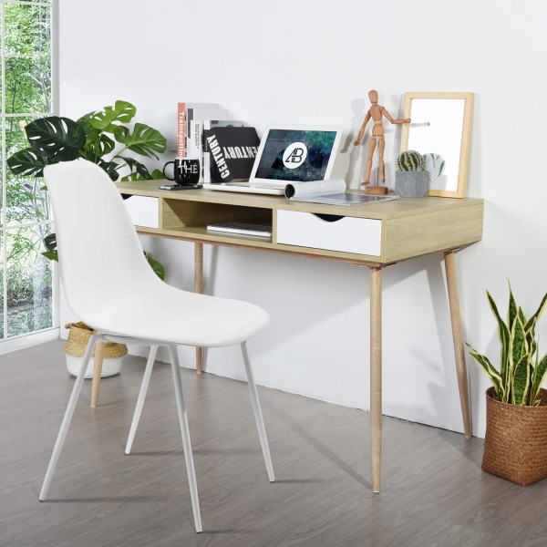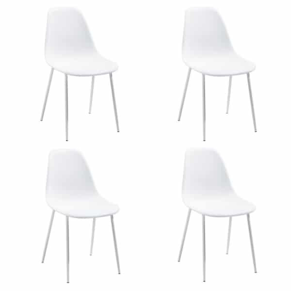כסאות לבנים לפינת אוכל בעיצוב נקי צעיר ומודרני. הכסאות עשווים מפלסטיק חזק עמיד וקל לניקוי, מסגרת הכסאות עשויה ממתכת אל חלד חזקה ויציבה.