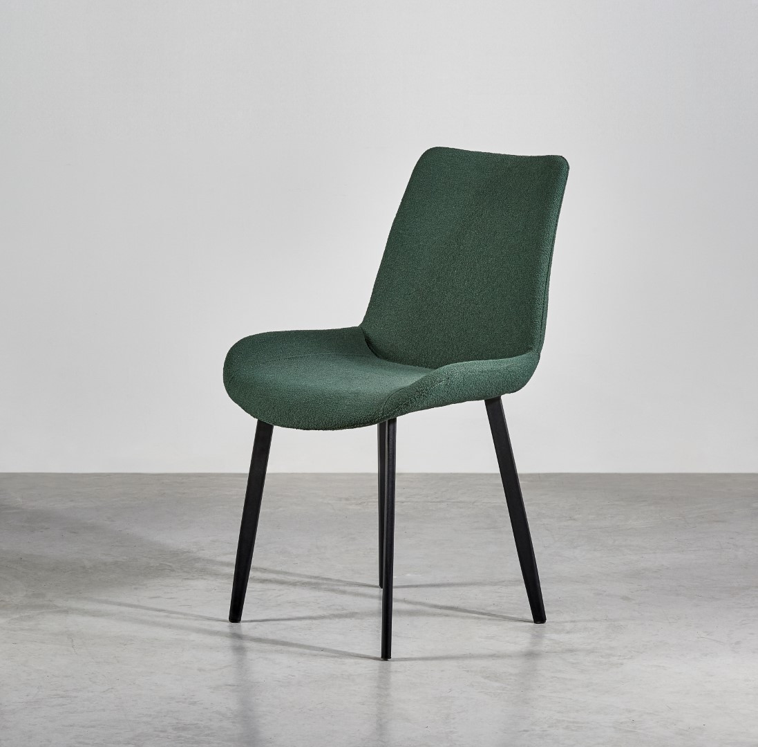 הכסא מתאפיין בעיצוב מודרני ונקי, עם קווים אלגנטיים וגימור מושלם. בד הבוקלה הירוק מוסיף טאץ' של רעננות וסטייל, ומשתלב בצורה מושלמת עם רגלי המתכת השחורות והחזקות.